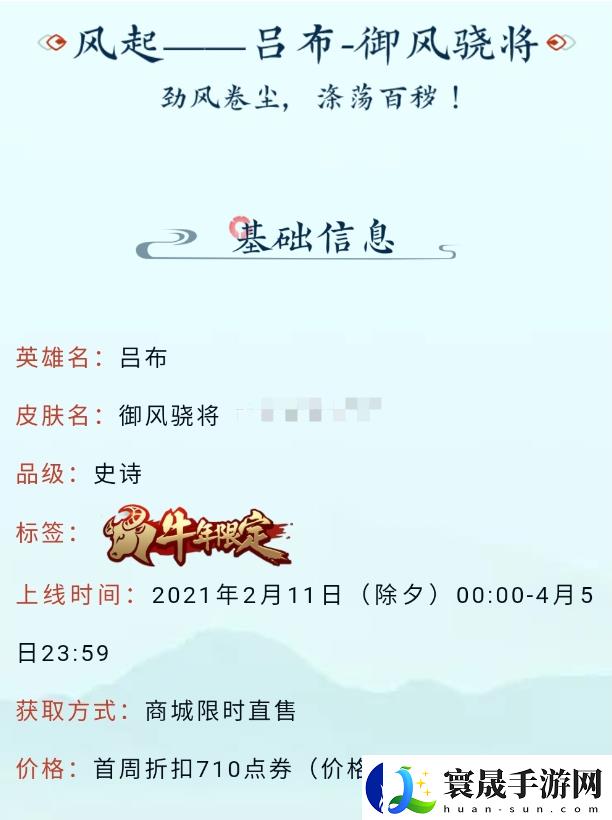 2021王者荣耀牛年限定吕布御风骁将皮肤多少钱-牛年限定皮肤吕布御风骁将一览