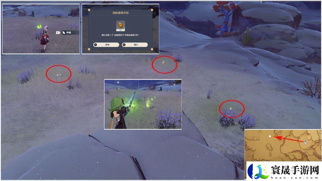 拿到任意3颗金蔷薇种子后,来到阿凡的苗圃种植3颗金蔷薇并用草元素激活