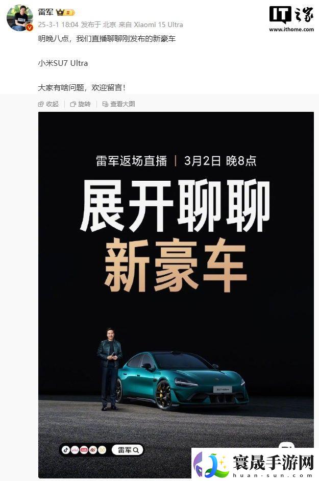 感谢本站网友 顺势而为、星痕永至、風見暉一、Anon_Tokyo、Autumn_Dream、BlackMio 的线索投递! 本站 3 月 1 日消息,雷军今晚宣布将于明晚 8 点返场直播,展开聊聊新豪车小米 SU7 U