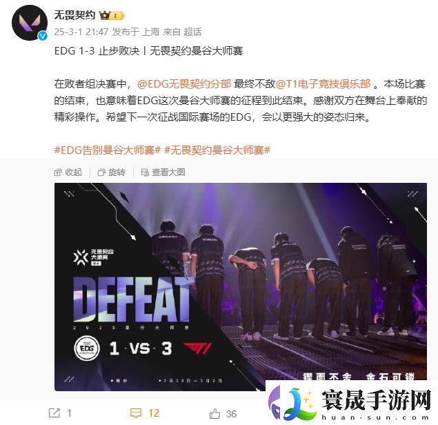 本站 3 月 1 日消息,在今晚举行的无畏契约曼谷大师赛败者组决赛中,EDG 战队以 1:3 的成绩败于 T1,但也已经为 CN 瓦在大师赛的征程上创造了新的历史。